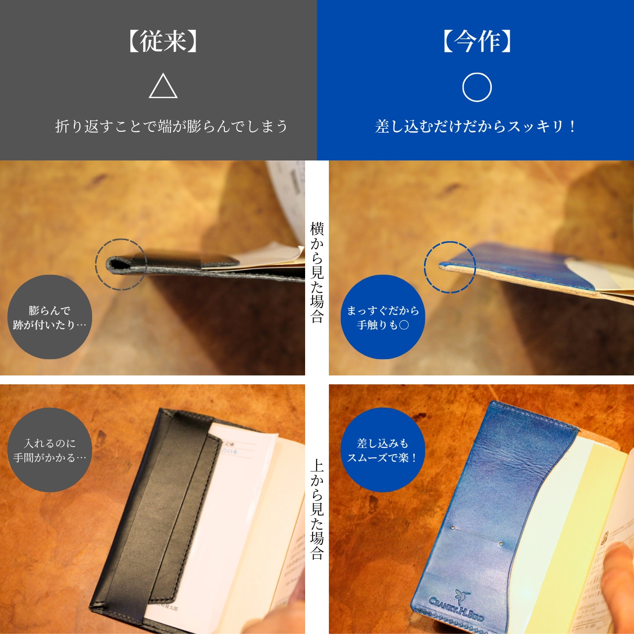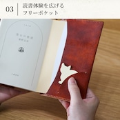 一般的な一体型ブックカバーとは違い、本を差し込む際に折り目がつきにくく、薄い本から分厚い本までスムーズに装着できます。