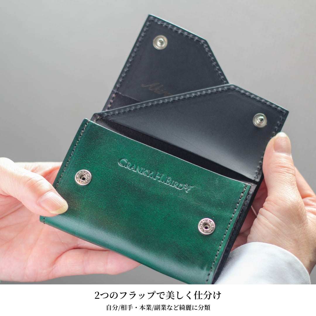 フラップが2つあることで、名刺を自然に分けて収納できます。