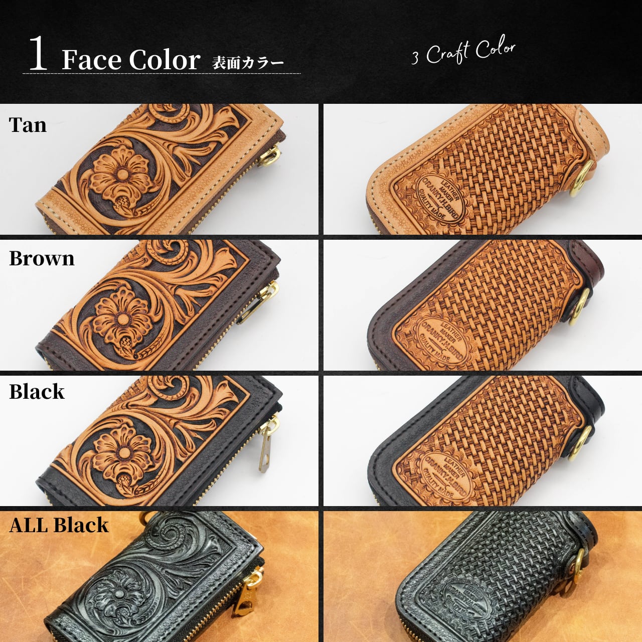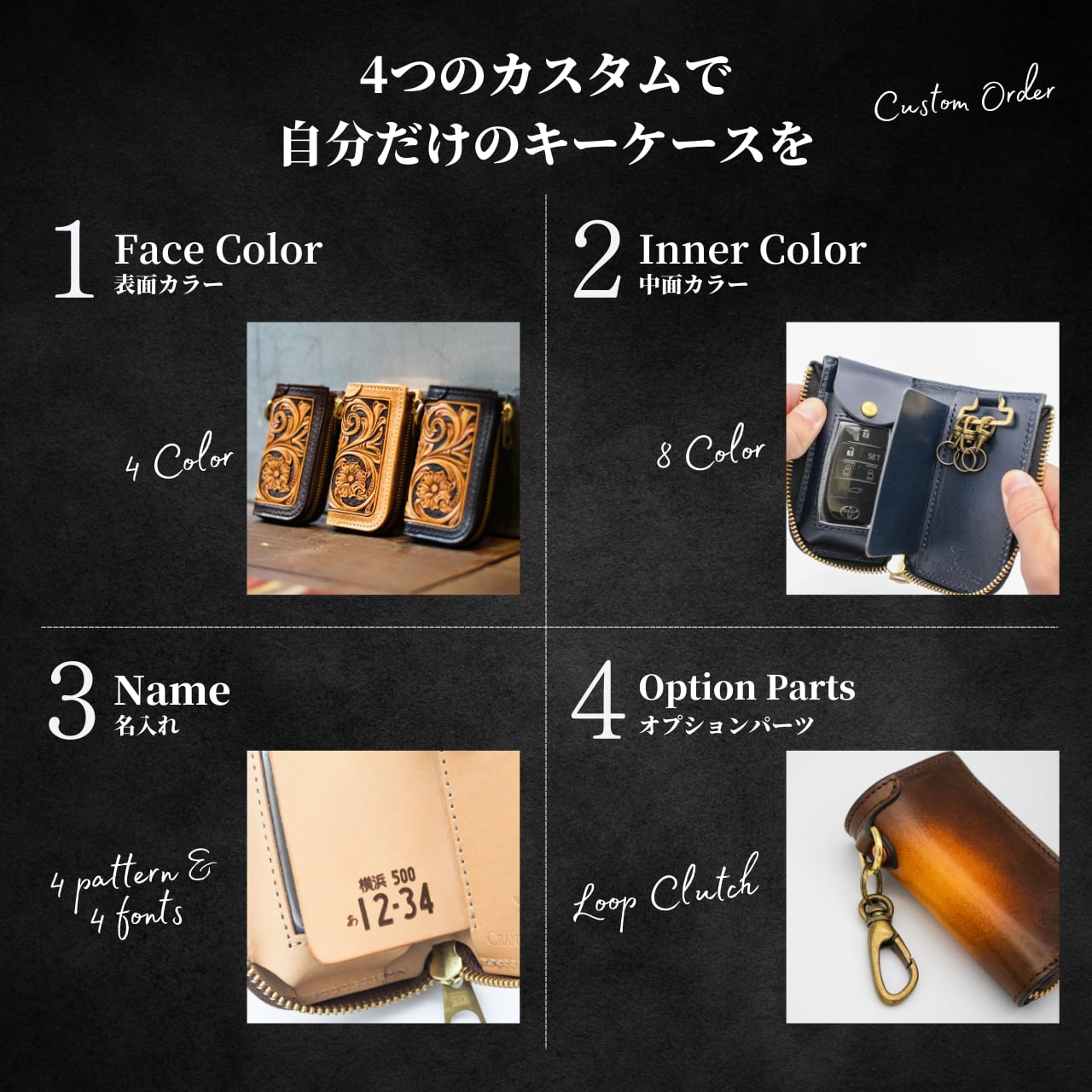 「フェイスデザイン(表面)」「インナーカラー(中面)」「名入れ」「オプションパーツ」の4つのカスタムで、世界に1つの本革キーケースをお作りいたします。