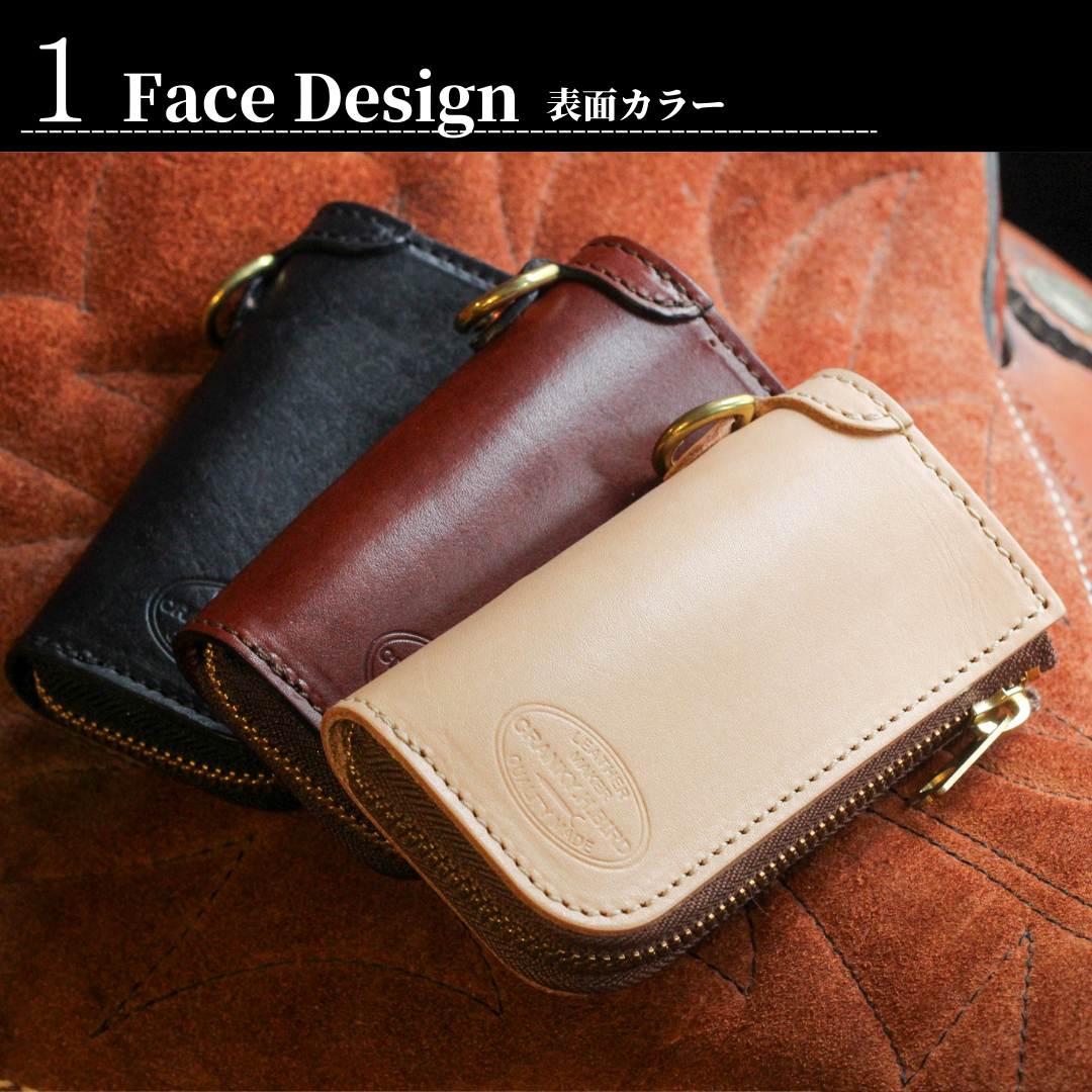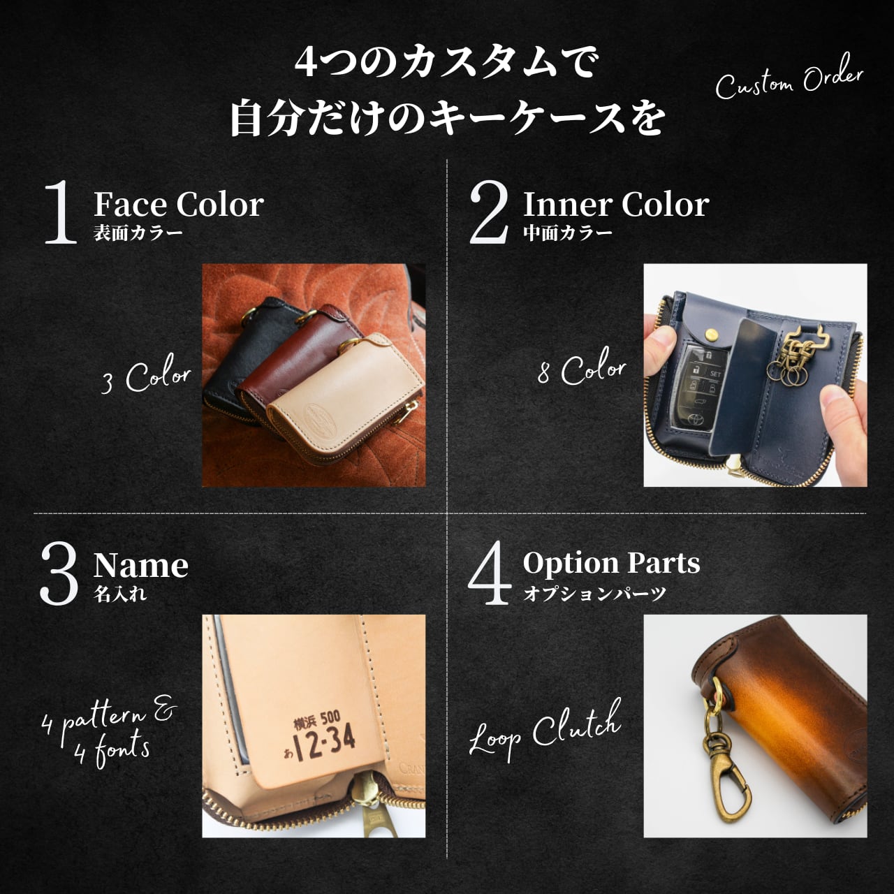「フェイスデザイン(表面)」「インナーカラー(中面)」「名入れ」「オプションパーツ」の4つのカスタムで、世界に1つの本革キーケースをお作りいたします。