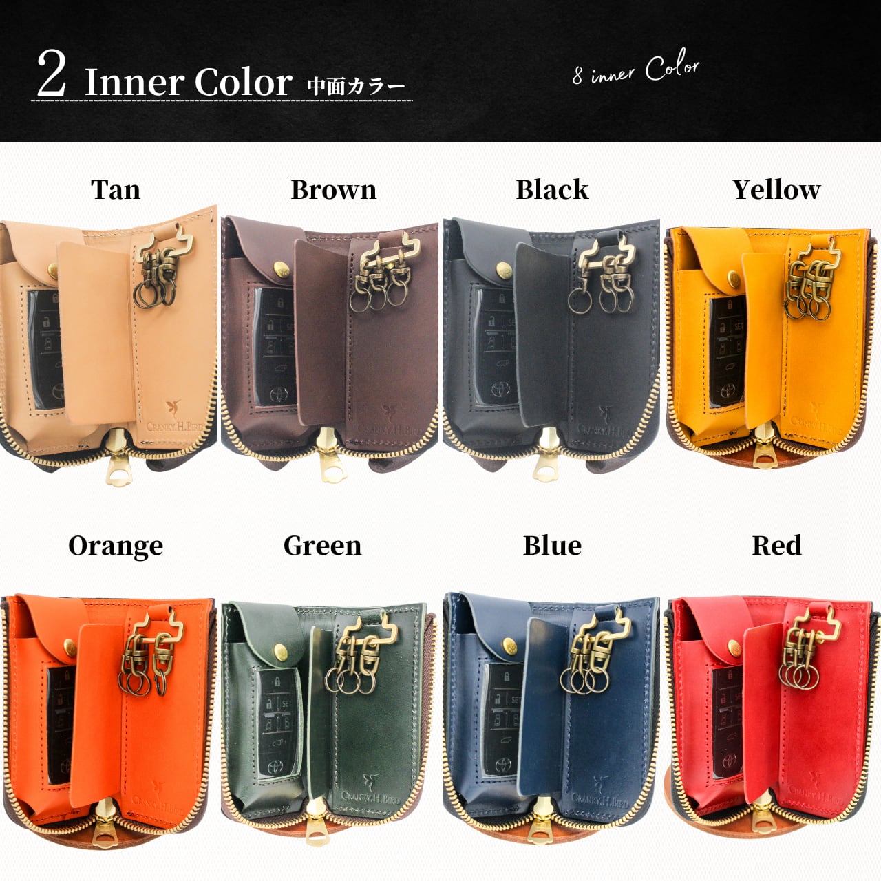 「フェイスデザイン(表面)」「インナーカラー(中面)」「名入れ」の3つのカスタムで、世界に1つの本革キーケースをお作りいたします。